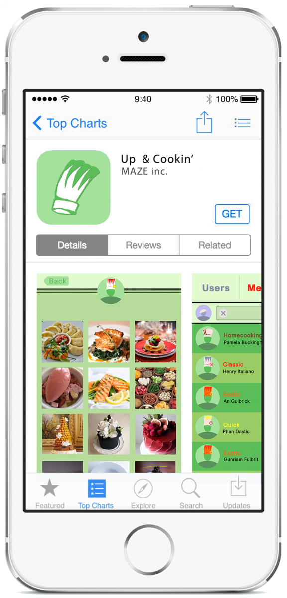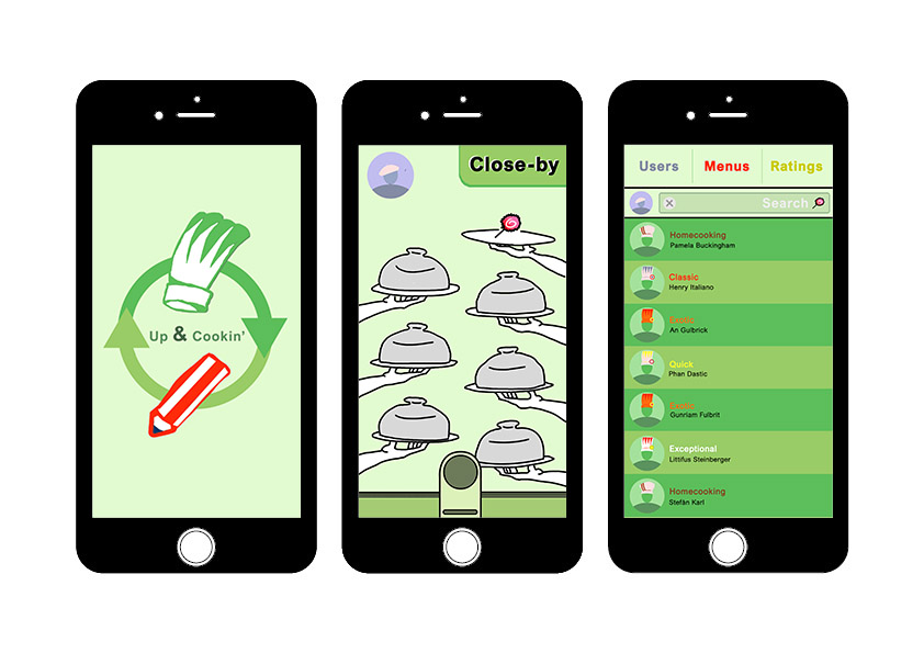 The main screen shows restaurant “cloche” being held up, these are nearby, available, chefs and clients. The cloche can be tapped on and opened to see more information about the users. The chefs and clients shown are often in proximity to the user’s own location, thus lowering the price of the chef’s service.